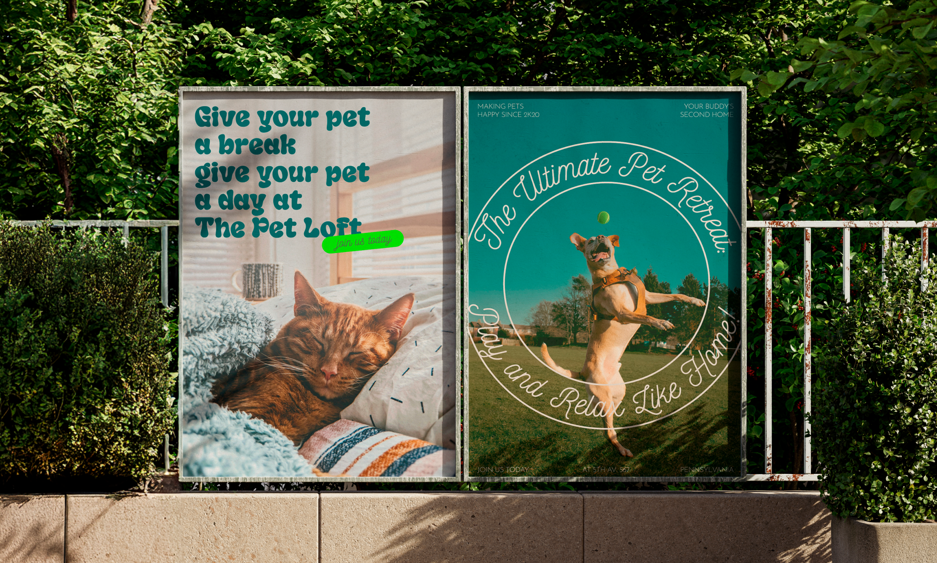 The Pet Loft is a concept project that aims to bring a cool and fun atmosphere to a pet hotel and daycare by mixing modern and vibrant elements, with bold colors and playful shapes, reflecting the energy and joy of our furry friends.